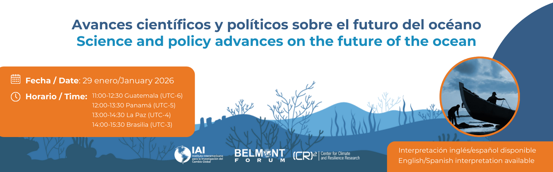 El evento abierto al público “Avances científicos y políticos para el futuro del océano” reunirá a líderes e investigadores para debatir las vías científicas y políticas hacia un océano sostenible y resiliente. También se anunciara la convocatoria de fondos de investigación Oceans 2 del Belmont Forum y el curso gratuito autogestionado “Una mirada transdisciplinaria para el futuro de los océanos” del IAI, CR2 y Belmont Forum.