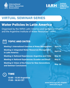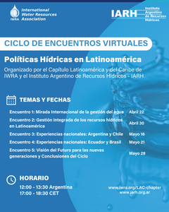 La Asociación Internacional de Recursos Hídricos -Capítulo Latinoamericano y del Caribe- (IWRA LAC) y del Instituto Argentino de Recursos Hídricos (IARH), organizaron un ciclo de encuentros sobre “Políticas Hídricas en Latinoamérica”, desarrollado virtualmente entre abril y mayo del año 2025. El objetivo del Ciclo fue explorar el desarrollo de las políticas hídricas en nuestra región y destacar como fueron evolucionando en el contexto global, generando el espacio para compartir experiencias así como identificar desafíos y propuestas para el futuro.